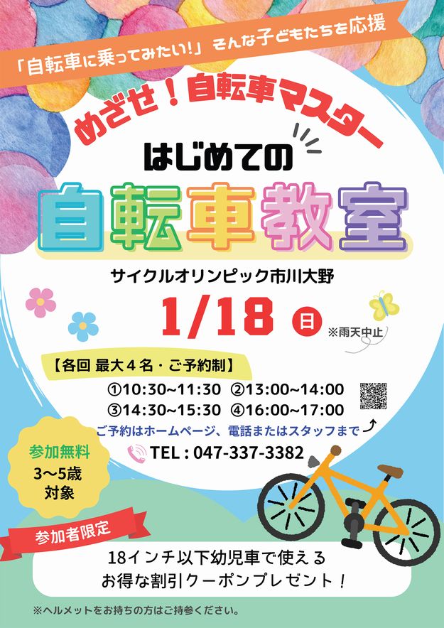 サイクルオリンピック市川大野店にて、1月18日(日)に「はじめての自転車教室」が開催されます。